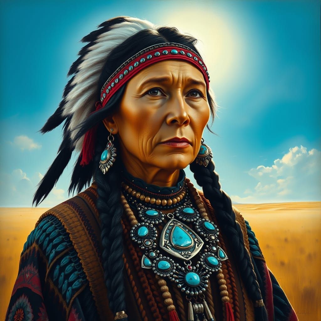 This image shows a stoic Native American woman in traditional clothing and detailed jewelry against a sunlit prairie. Rendered in a realistic oil painting style with dramatic lighting, it evokes the spirit of the Wild West.