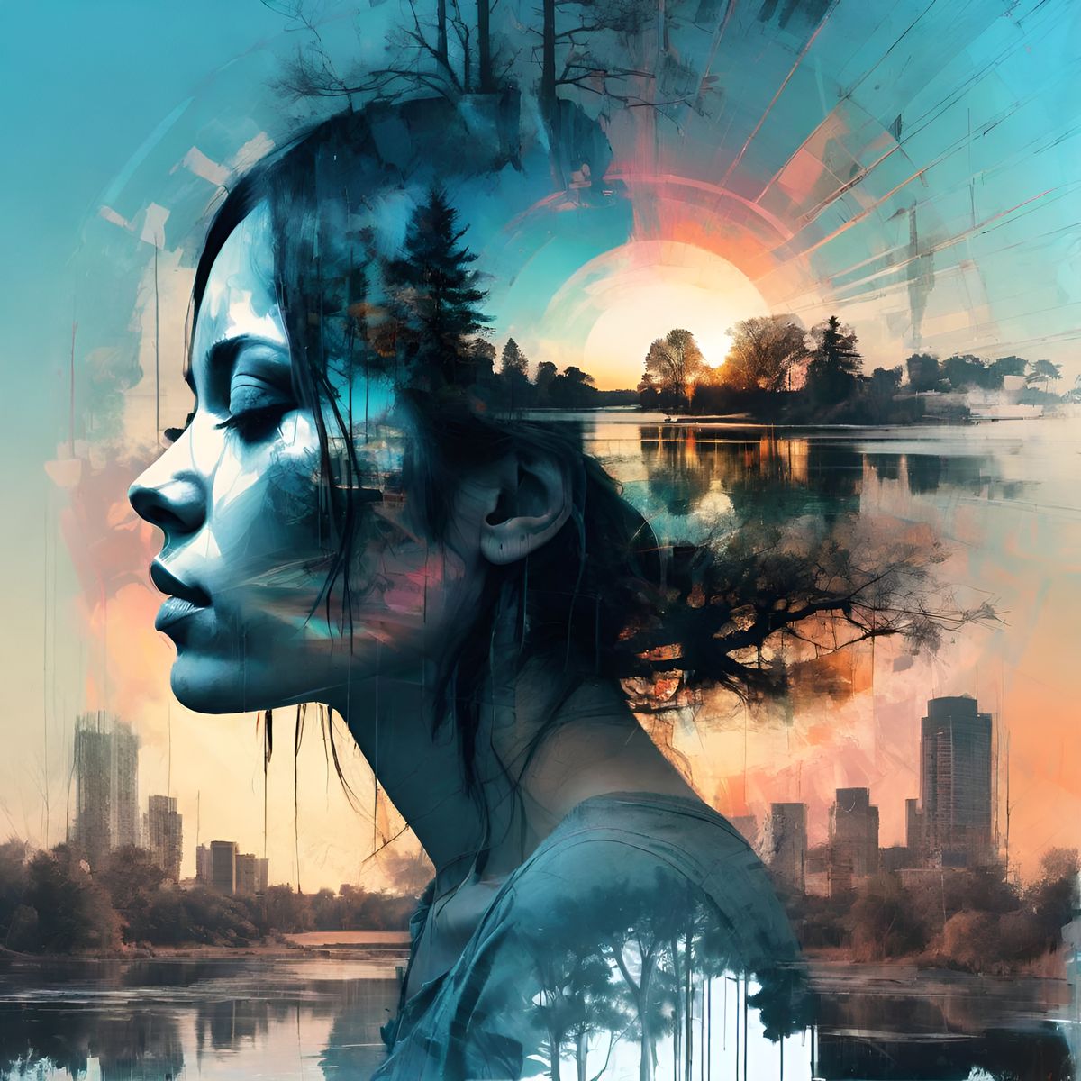 This image shows a surreal double exposure of a psychedelic lake scene with trees at sunset. Seeping colors and diffuse edges create a fantasy art style with a cityscape in the background.