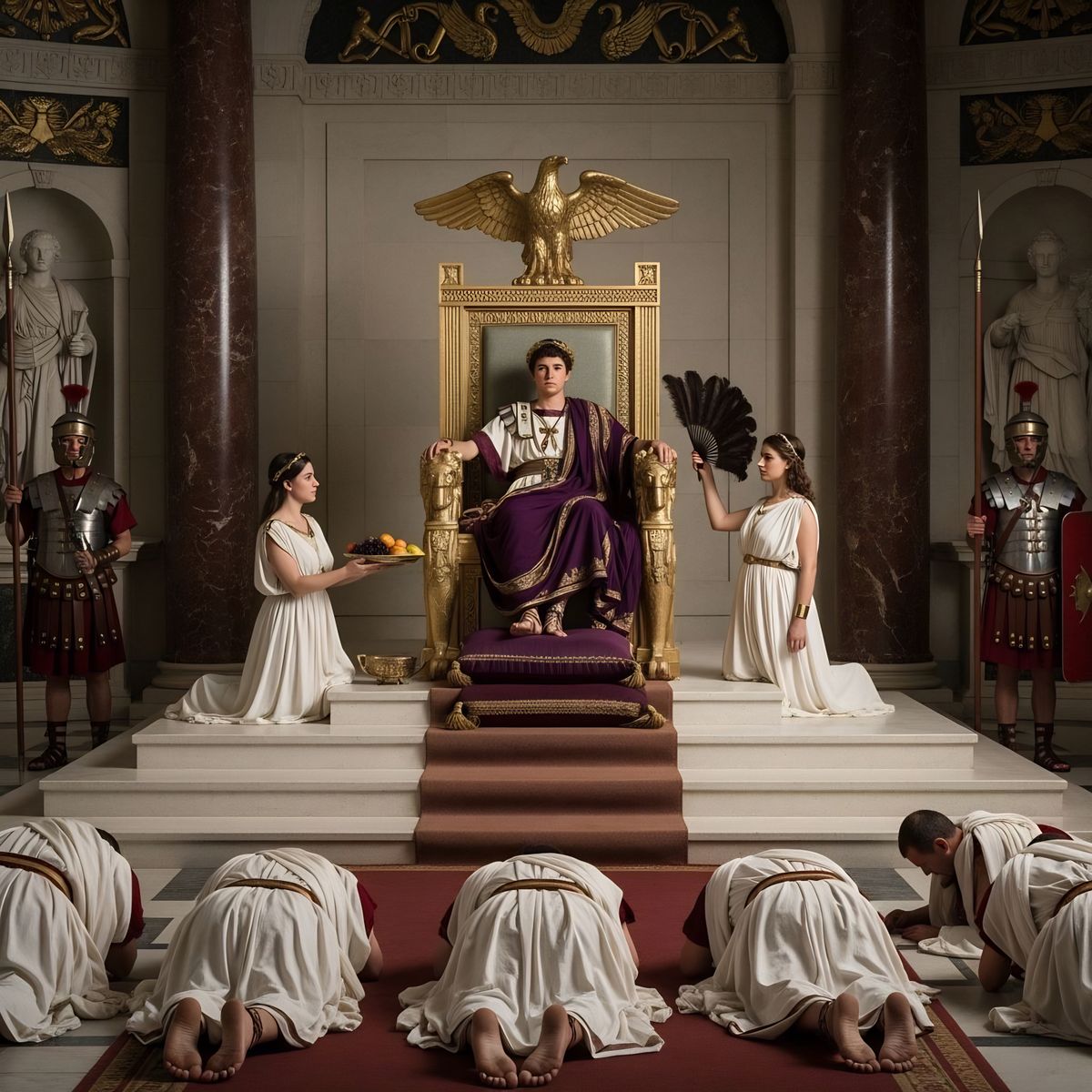 This image shows Emperor Caligula on his opulent throne, attended by servants and legionnaires. Roman senators pay homage in the vast throne room of his Imperial Palace. Rendered with a painterly quality.