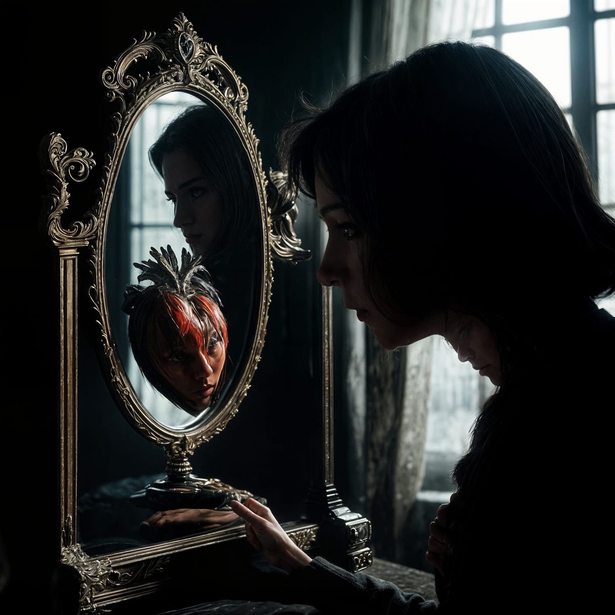 This image shows a broken mirror reflecting a scary figure holding a human heart. The scene is cinematic, with film grain, vignetting, and dramatic, atmospheric lighting.