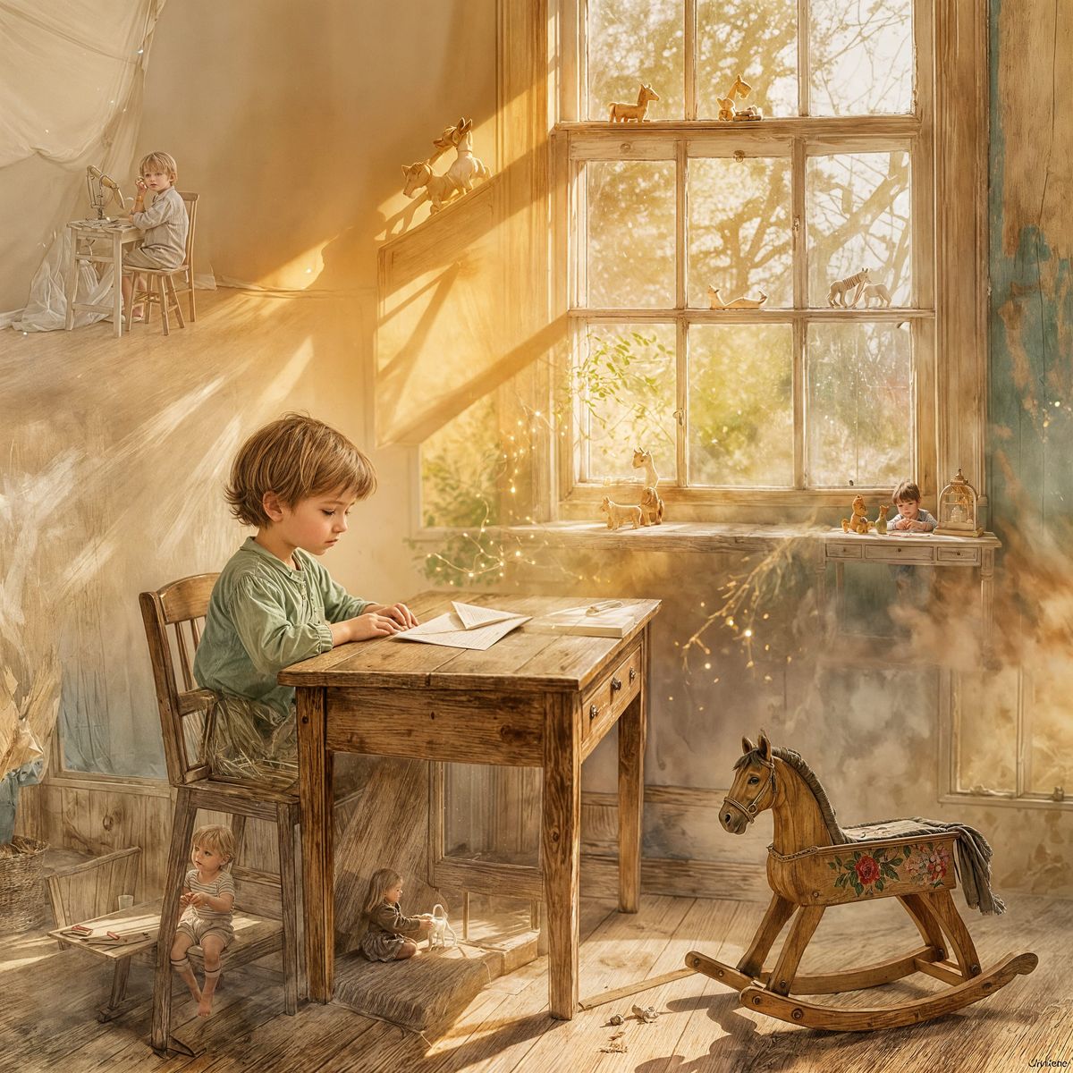 This image shows a vintage-style illustration of a child at a wooden desk with a letter. Warm light illuminates the scene, evoking nostalgia and innocence with delicate textures and pastel colors.