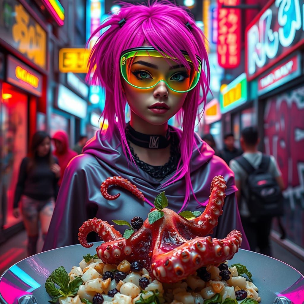 This image shows a cyberpunk girl with vibrant neon hair, posing in a crowded city street surrounded by neon lights and graffiti walls. In the foreground, a mutated Octopus dish with caramelized cloves, basil, and elderberries on a bed of steamed fennel and bok choy.