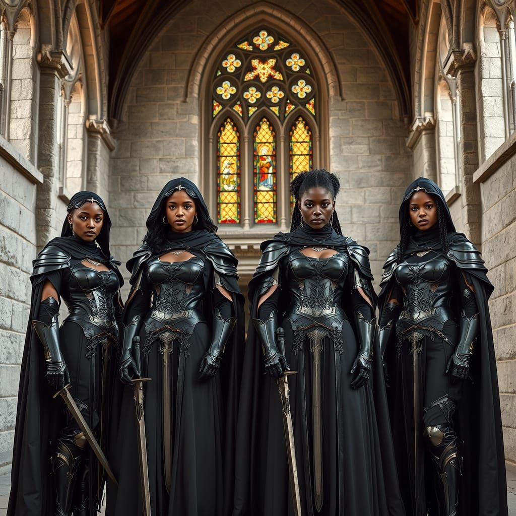 This image depicts four women in elegant dark knight attire, blending Gothic and futuristic elements, standing within a majestic medieval castle with intricate armor and flowing capes, set against a backdrop of stained glass windows and stone walls.