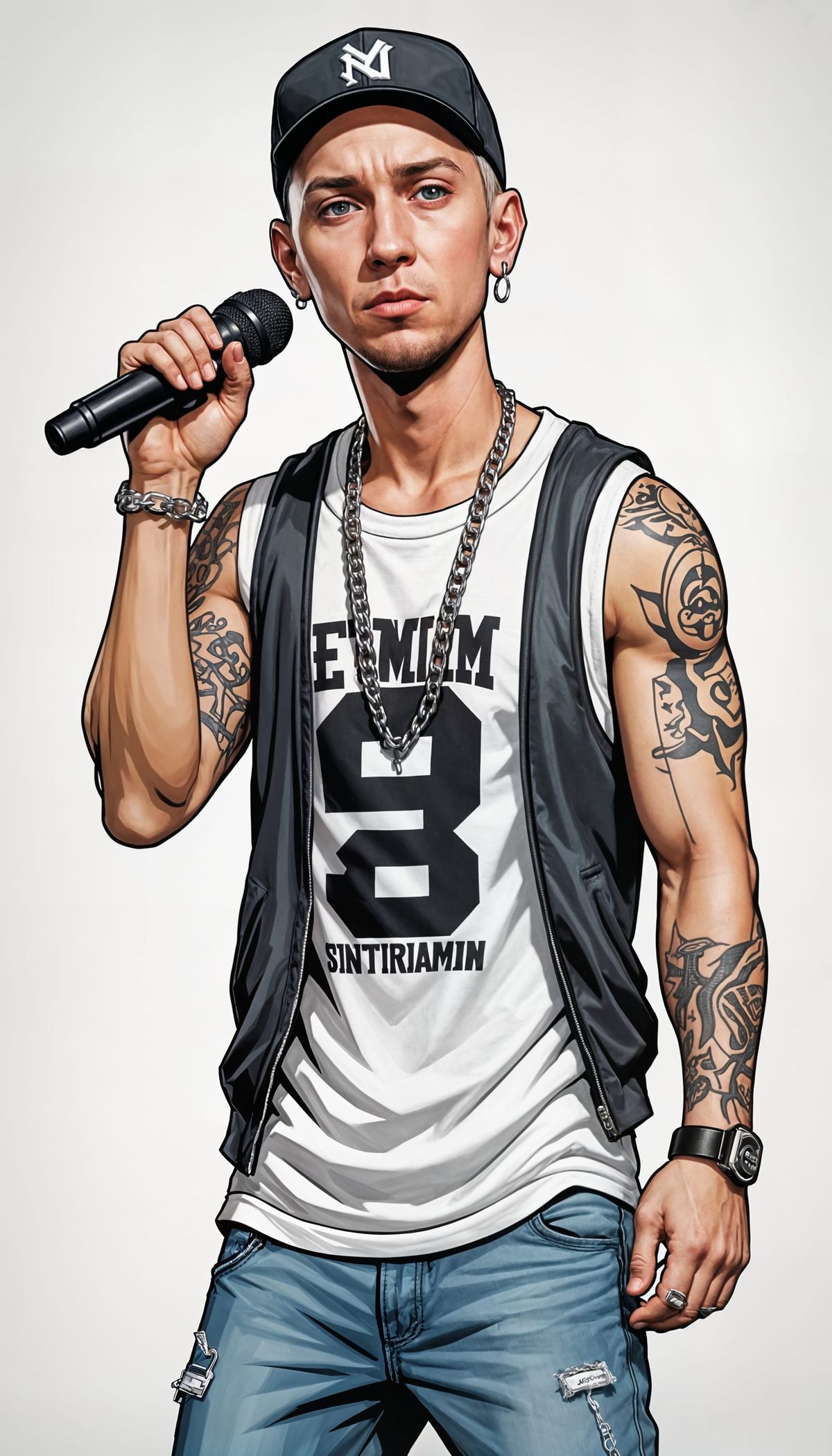 This image shows a cartoon caricature of Eminem in a classic rap battle pose. The vector illustration is designed for a t-shirt, set against a clean white background.