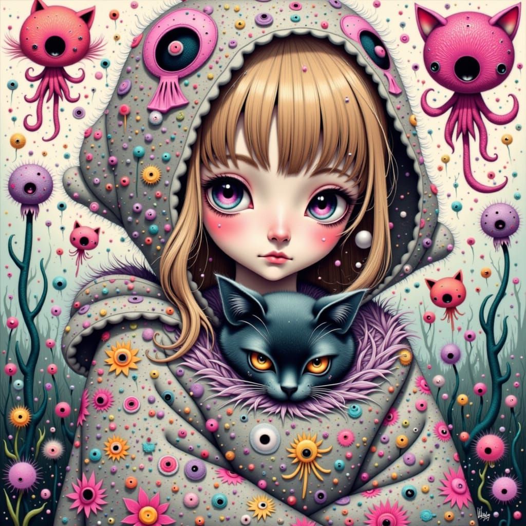 A surreal image of a young woman holding a cat, surrounded by vibrant doodles and amoeba-like shapes. This artwork has a surrealist aesthetic with dreamlike qualities.