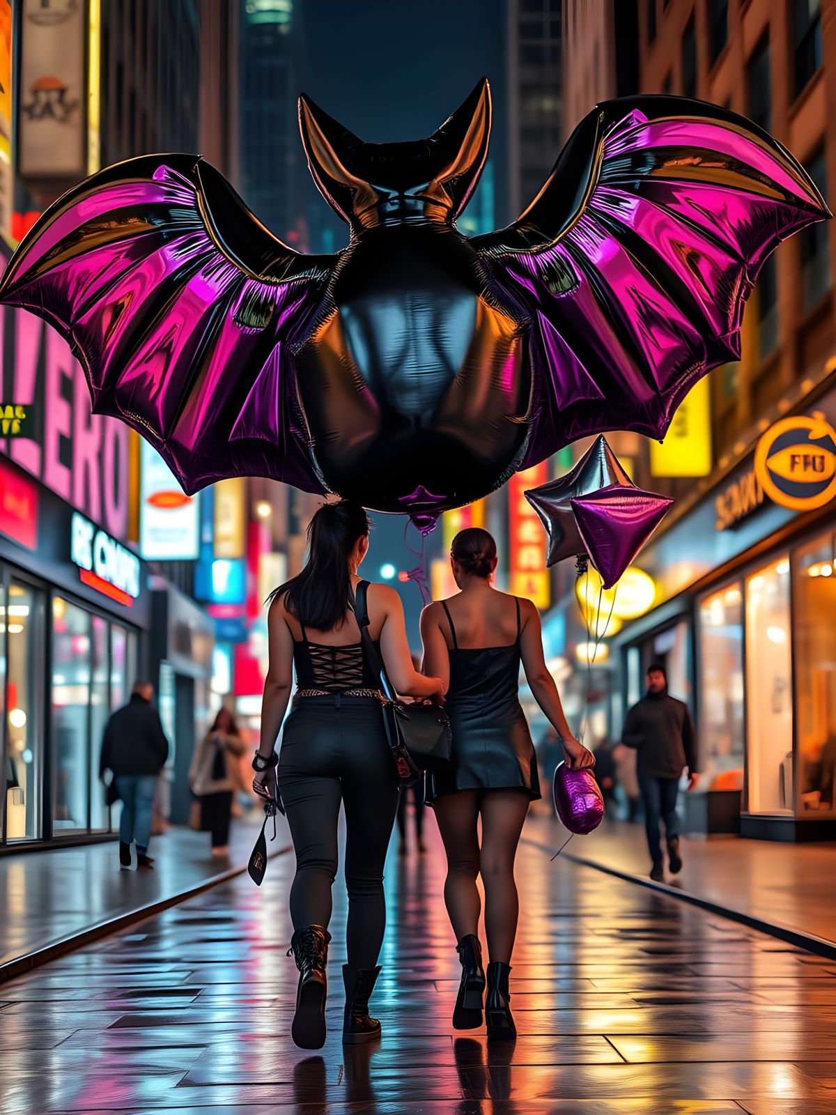 A vibrant city night scene featuring a large, iridescent bat-shaped balloon floating above two stylish women. The friends stroll down a rain-slicked street filled with neon lights, creating a surreal and eye-catching display.