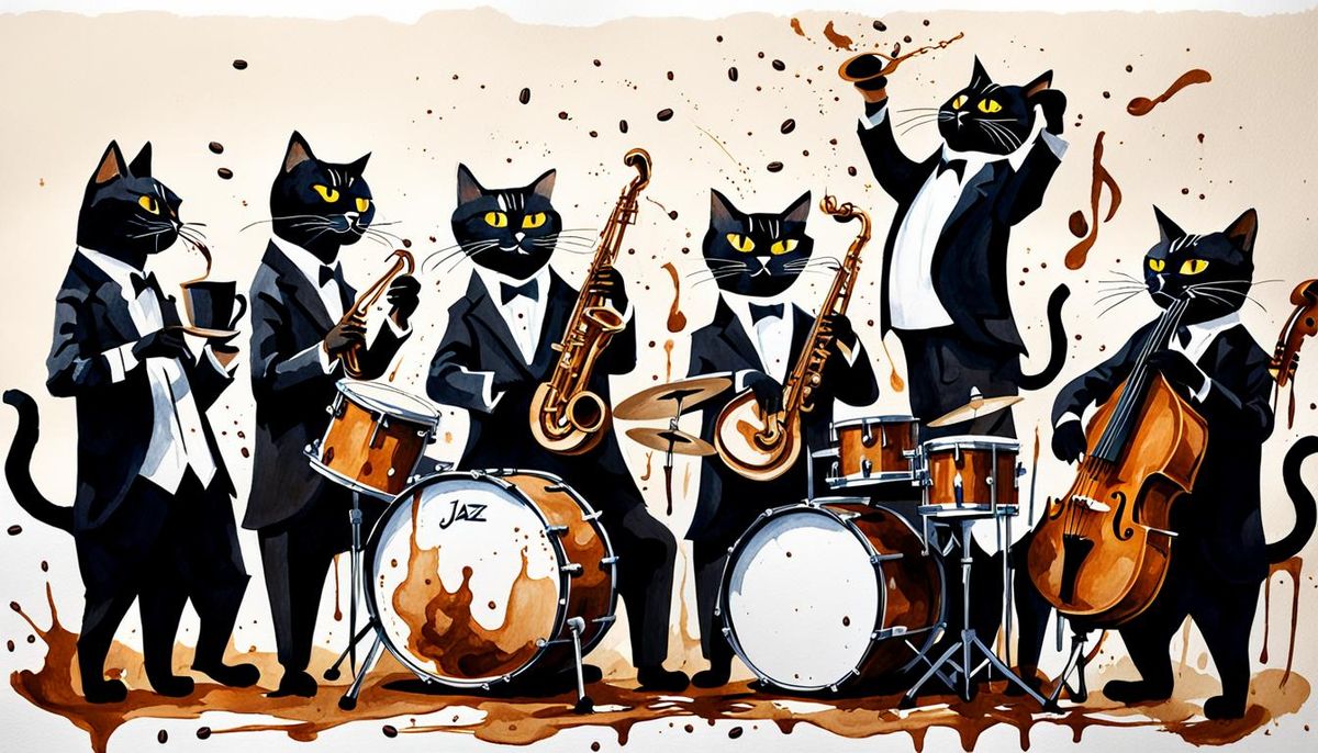 A photo of abstract jazz musicians depicted as anthropomorphic cats. The artwork, created with spilled coffee on paper, has a dynamic and textured aesthetic.