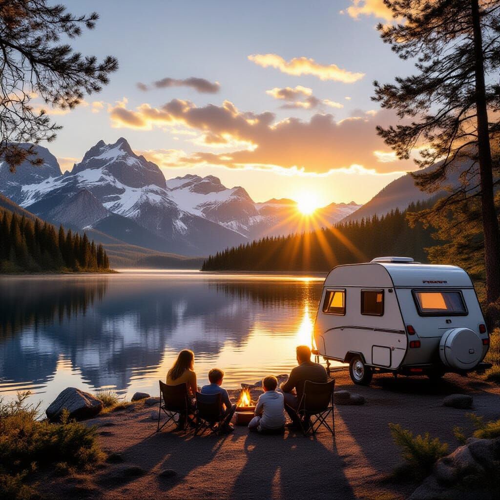 A photorealistic 8k landscape showing a family camping beside a tranquil lake during a golden hour sunrise. Snow-capped mountains rise behind them, with reflections on the water.