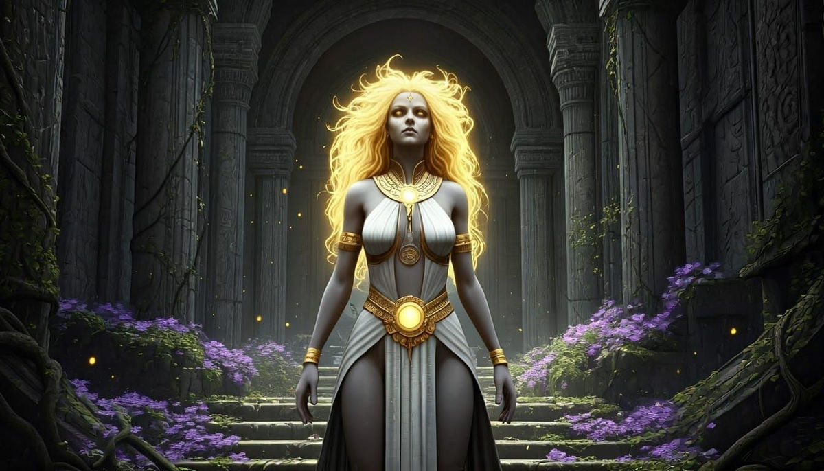 "A sun witch with flowing golden hair stands in a ruined temple, overgrown with vines and flowers. She wears revealing white vestments with golden trim and a sun symbol necklace. The scene is rendered in a black and white comic book style with touches of yellow, reminiscent of Mark Brooks and Dan Mumford, perfect and smooth. A masterpiece, 8k resolution, dark fantasy concept art, by Greg Rutkowski, dynamic lighting, hyperdetailed, intricately detailed, splash screen art, trending ..."