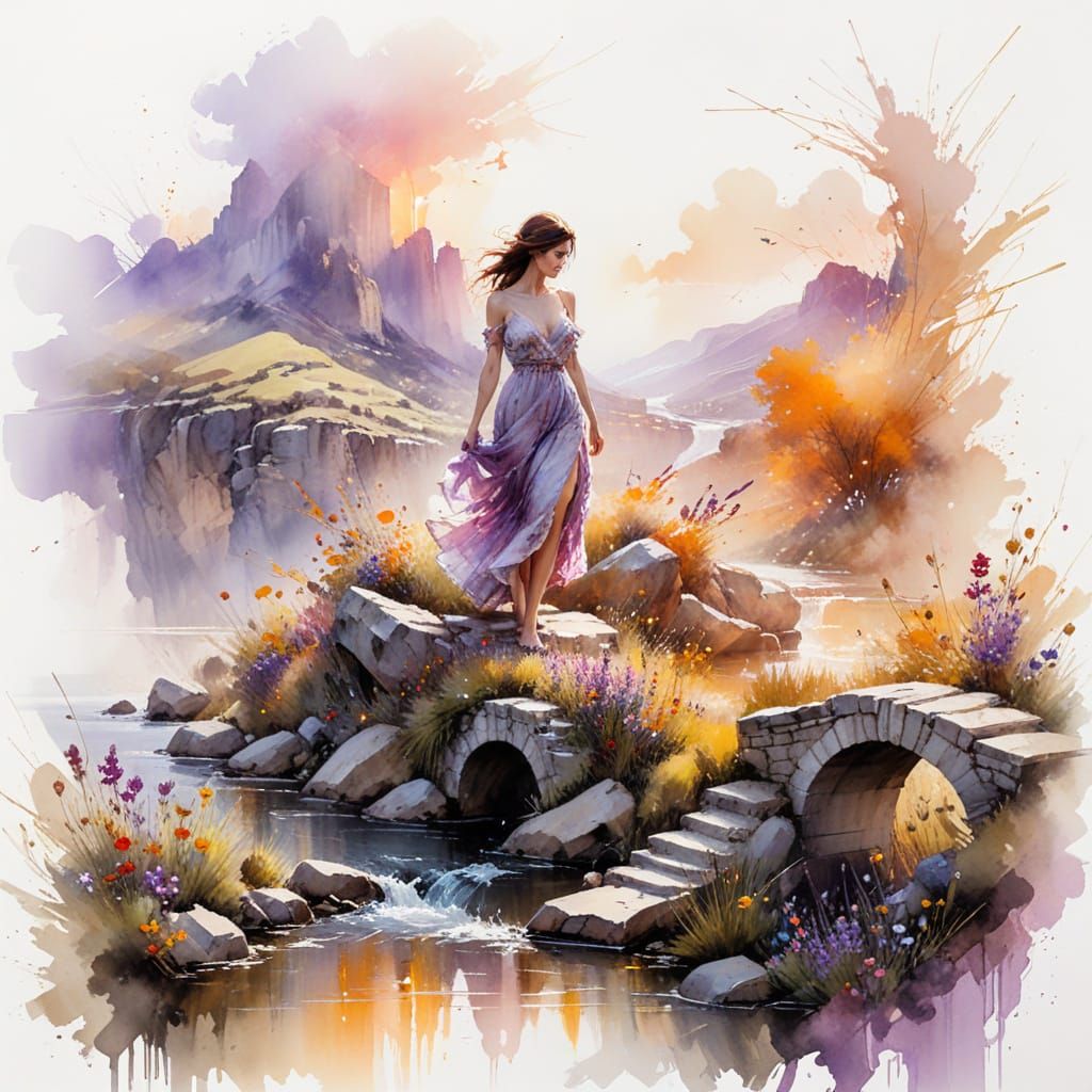 This image shows a lush valley at sunset, with wildflowers, a river reflecting golden light, and a stone bridge. The sky features vibrant crimson, peach, and violet hues. Rendered in a painterly, stylized watercolour aesthetic with a warm atmosphere.