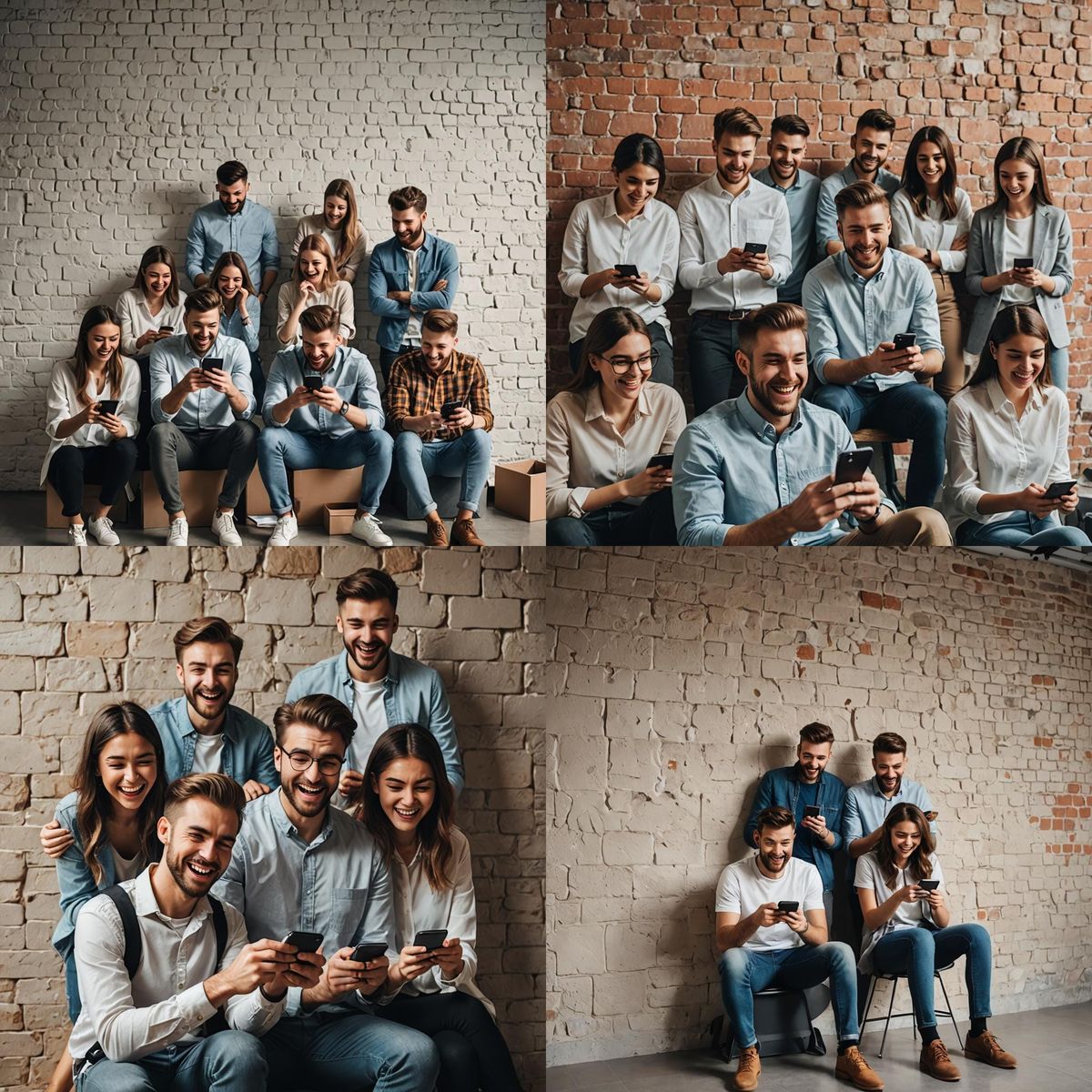 This image depicts a busy office scene where many young professionals are working diligently. One person stands apart, enjoying a moment of levity while using their phone and smiling.