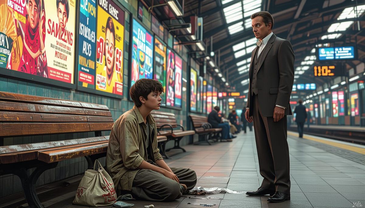 A striking picture of a 15-year-old beggar at a train station, observed by a wealthy man. This hyperrealistic image uses splash art techniques and rich colors to capture the boy's surprised expression.