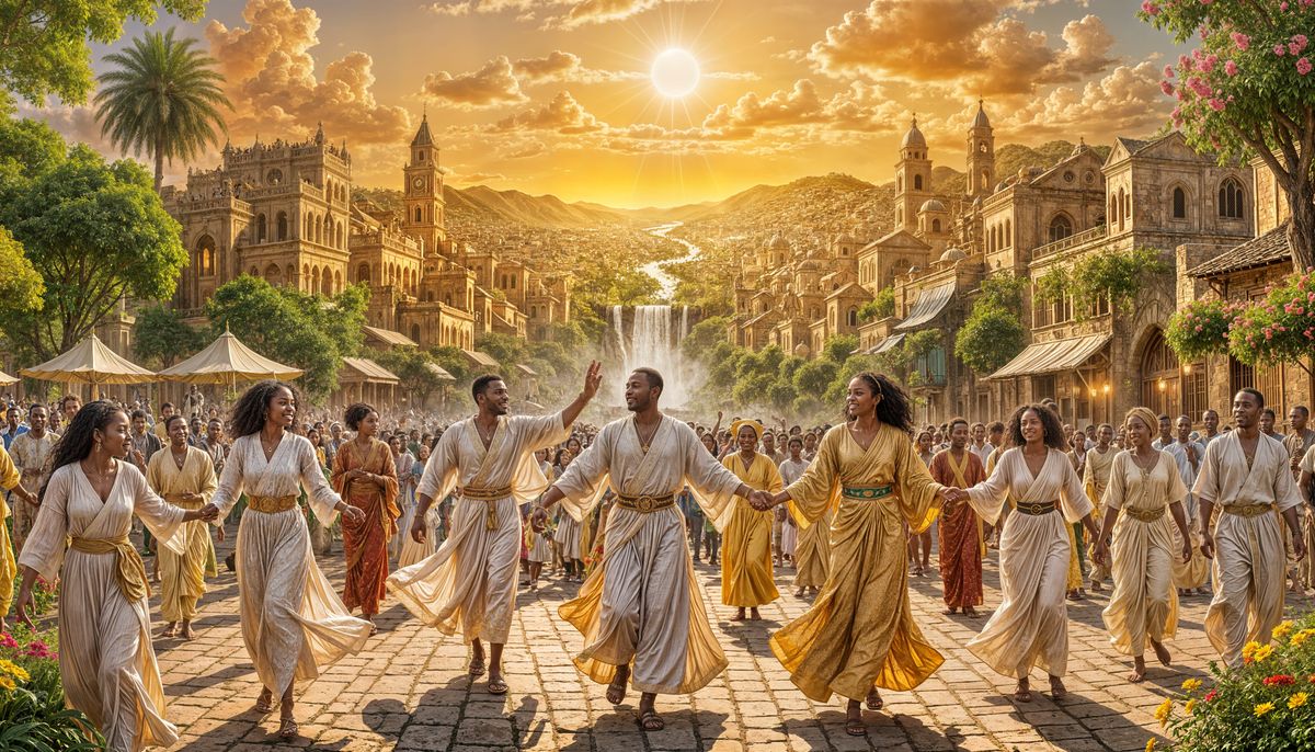 This image depicts a joyful, thriving community in a restored Earth, surrounded by lush greenery, sparkling rivers, and vibrant gardens. The scene radiates peace, harmony, and divine light, with people of all ages wearing flowing white and gold garments, celebrating and gathering in a spiritual atmospher...