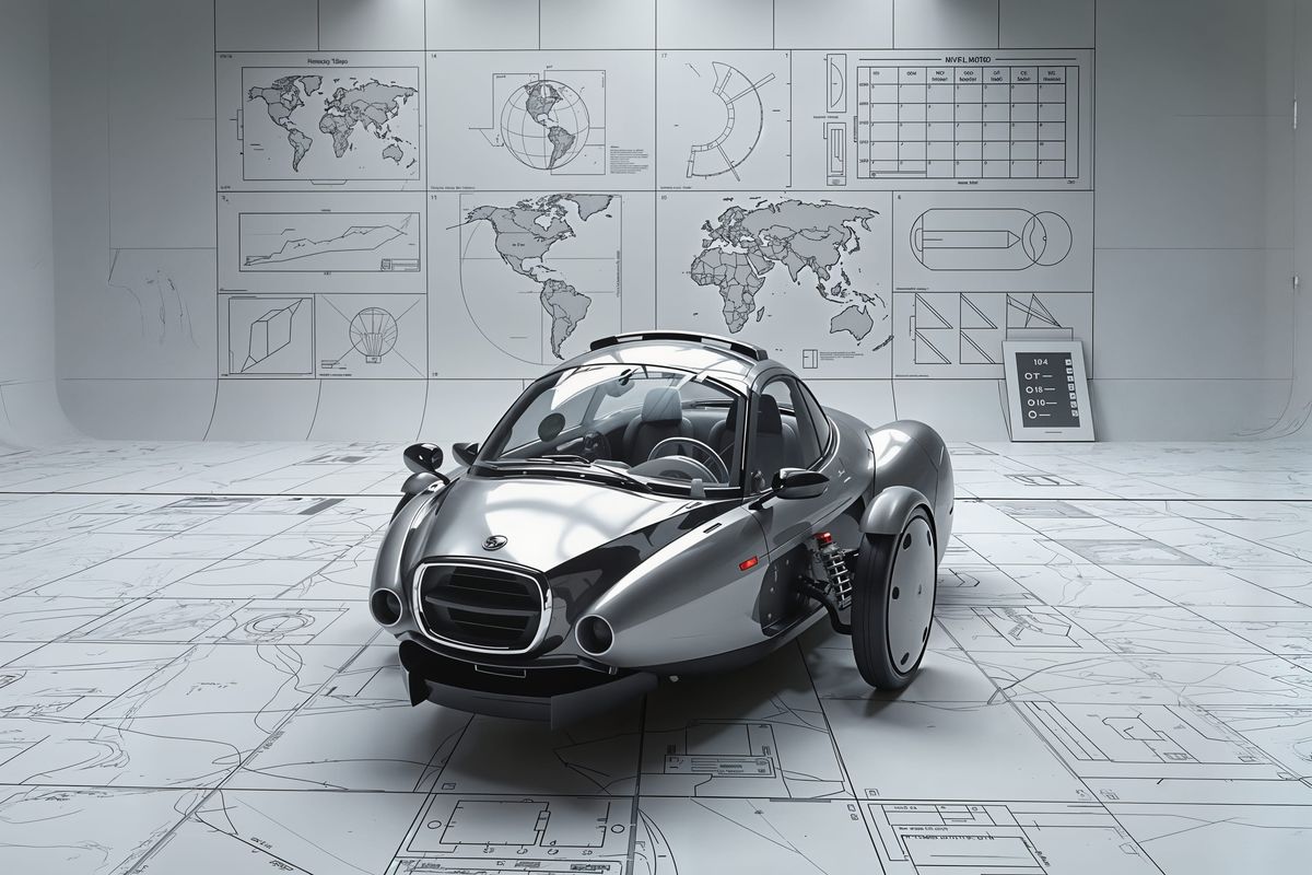 This image shows a highly detailed, futuristic flying car with a chrome engine and glass dome. The backdrop features blueprints, creating a dramatic, cinematic, and atmospheric sci-fi scene.