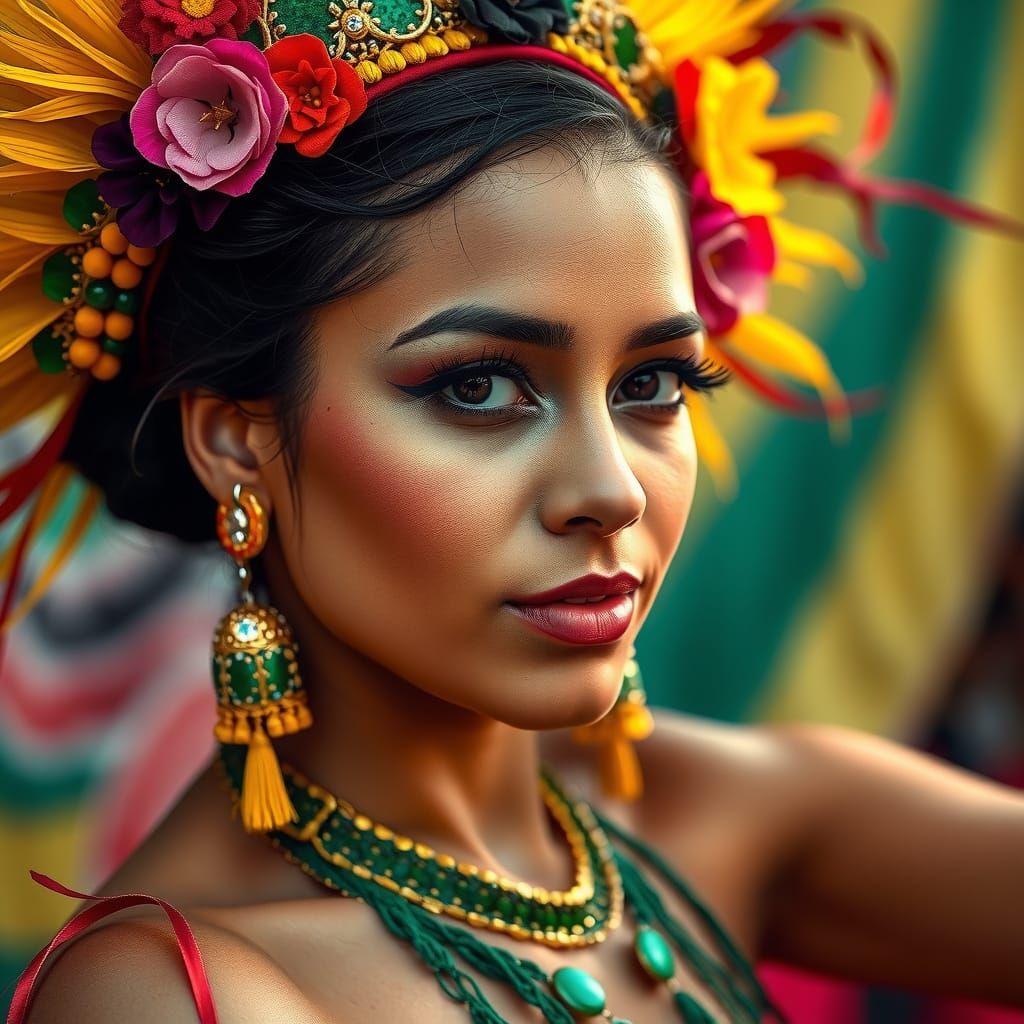 This hyperrealistic image shows a stunning Latin American woman, the year's most beautiful dancer, celebrating at a vibrant Brazilian festival with a colorful background and dramatic lighting.