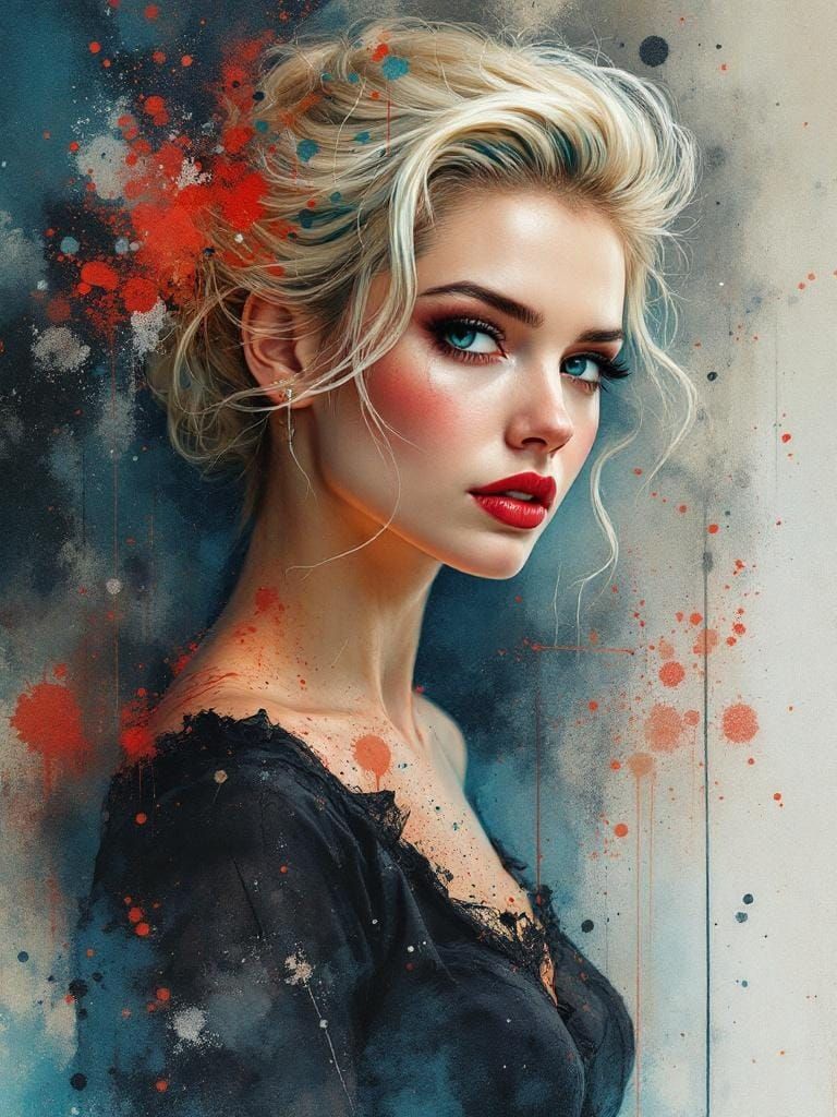 This image shows a vintage pin-up woman with teal-tipped blonde hair making eye contact. The artwork blends watercolor techniques with surrealist and atmospheric effects, featuring fluid ink textures and smoky gradients in muted earthy tones.