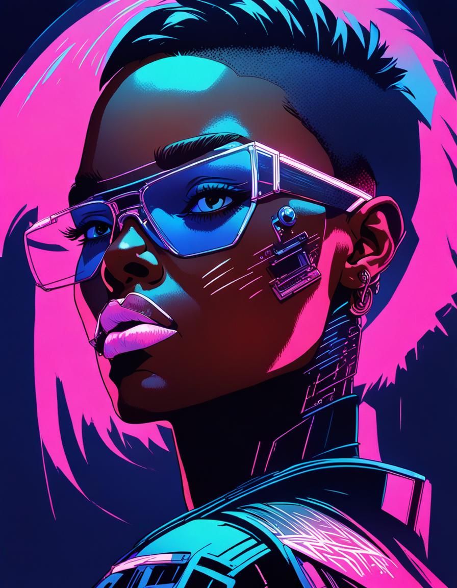 This image shows a close-up of a young Black woman with very short hair and black glasses, illuminated by soft pink and blue stage lighting in a retro cyberpunk aesthetic.