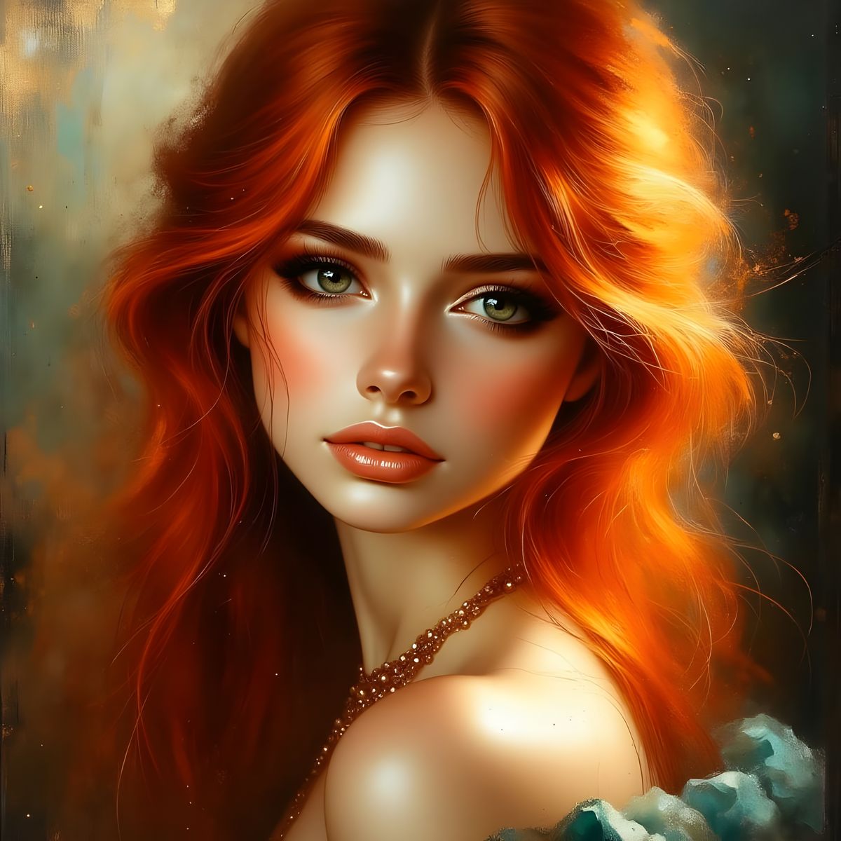 This image shows a beautiful Norse goddess with blazing red hair and green eyes. Rendered with fair skin and a gentle smile, bathed in natural light.