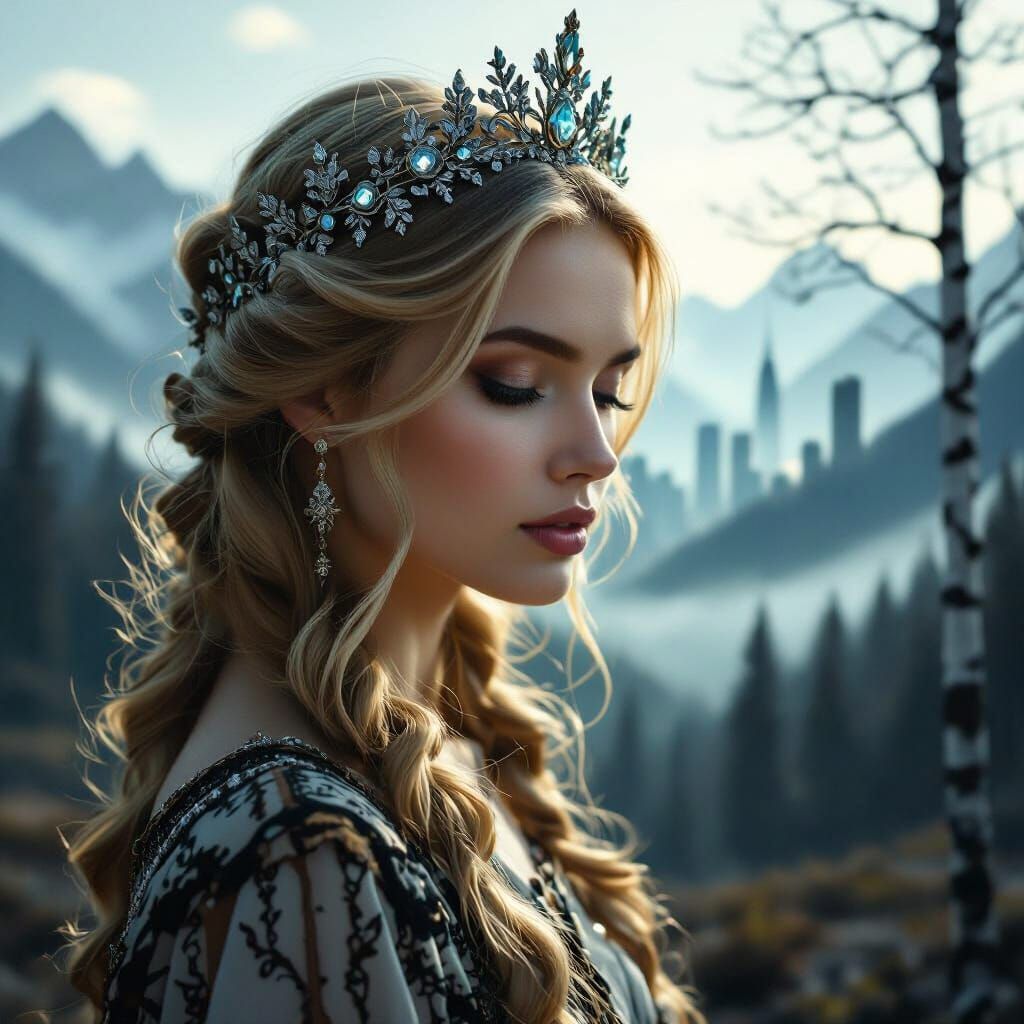This image shows a beautiful Slavic woman with crystal-blue eyes gazing downward. She is set against a surreal double exposure of a futuristic city and a sun-drenched valley in a grayscale birch forest, in a photorealistic style.