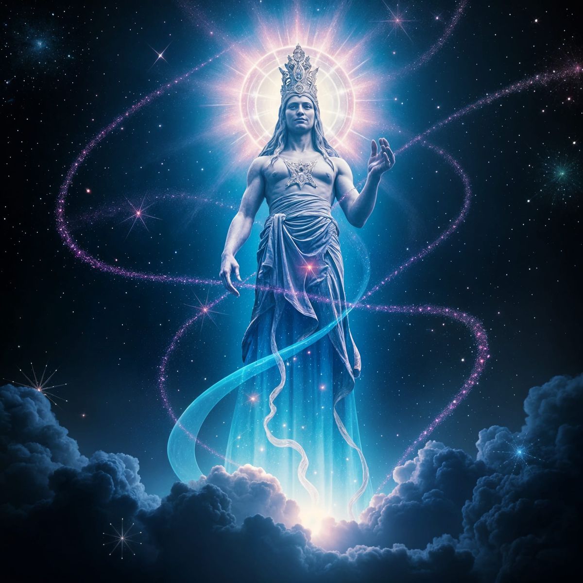 A striking picture of a cosmic god in a deep universe filled with light and particles. The image is rendered with vibrant colors and ethereal threads in a fantasy art style.