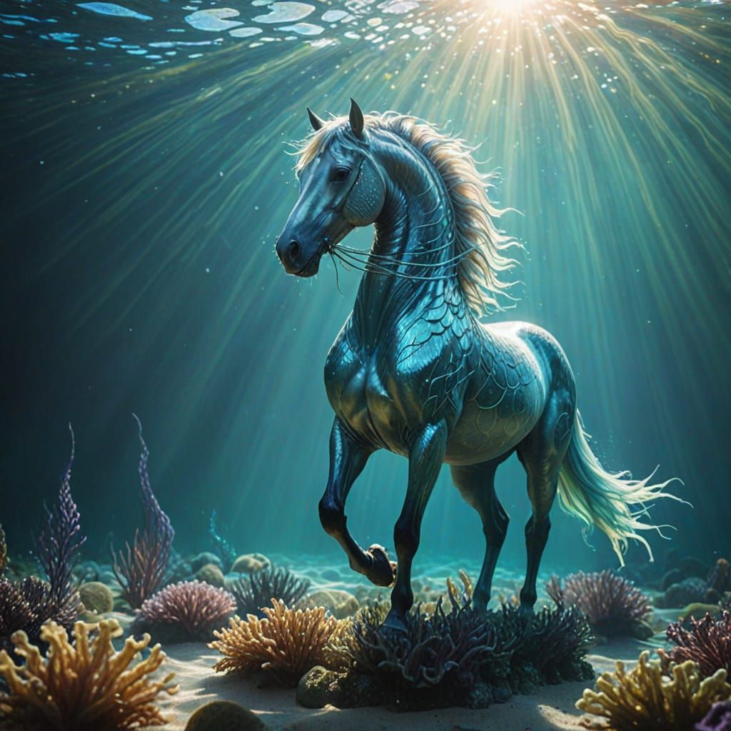 A striking picture of a mythological water demon. The creature has the front of an Arabian horse and a fishtail. Iridescent scales shine in the soft, divine light.