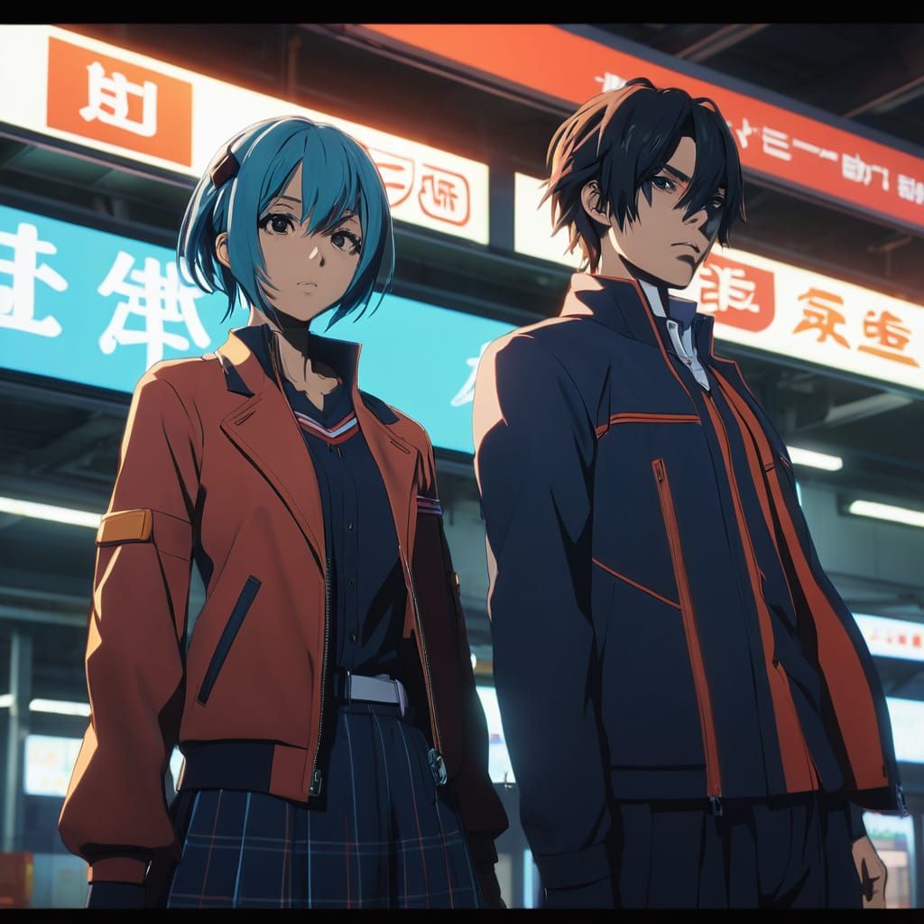 This image shows Piri and Tommy Villiers performing in a vibrant, manga-style concert. The artwork features dynamic lighting, soft film grain, and warm colors, rendered as 3D anime art.