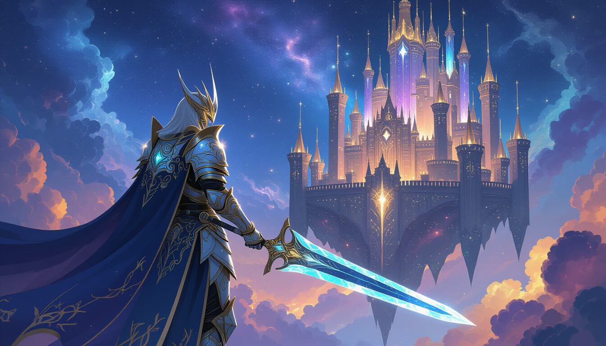 A celestial knight in glowing starlight armor protects a floating castle amid swirling nebulae. This digital painting is reminiscent of dreamlike cosmic fantasy art, rendered in deep blues, purples, and golds.