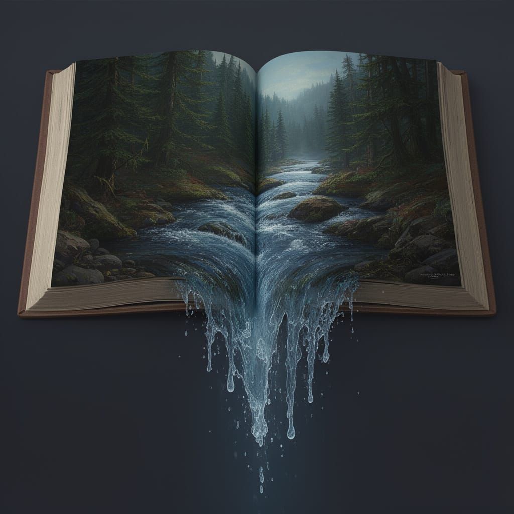 This image depicts an open book with a matte painting of a river in an evergreen forest. The water flows off the page while retaining its form, a fantastical concept art piece.