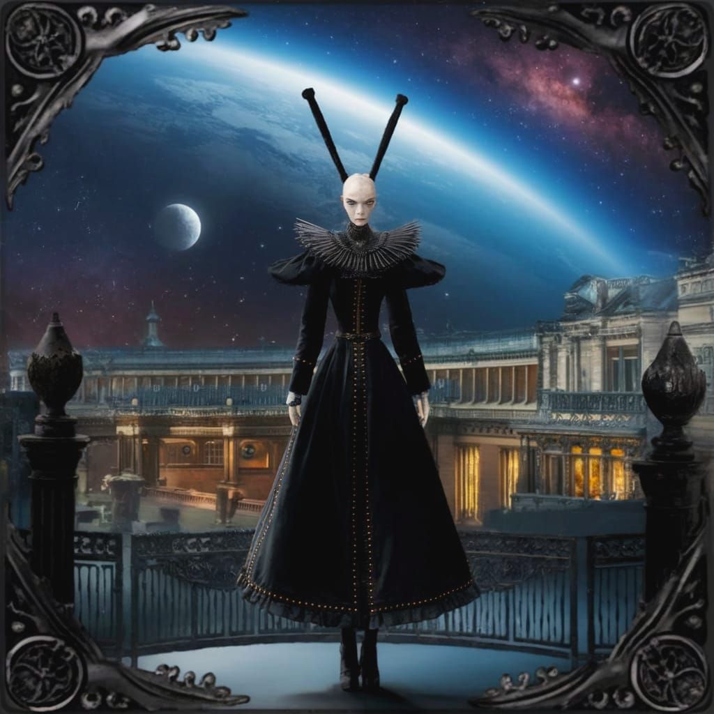 This AI-generated image depicts a Victorian England setting with an extraterrestrial theme, blending historical aesthetics with otherworldly elements.