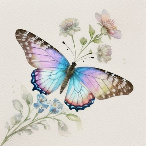 This beautiful watercolor illustration captures a delicate butterfly perched on a charming flower with soft, ruffled petals, set against a crisp, snow-white background. The artwork features intricate details, pastel hues, and gentle patterns, creating a dreamy and ethereal atmosphere.
