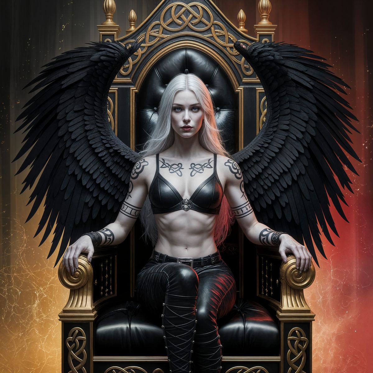 This image depicts a mystical, albino Celtic warrior with dark hair, black wings, and Celtic tattoos, sitting on a throne amidst a dramatic, painterly scene with vibrant colors and chiaroscuro lighting.