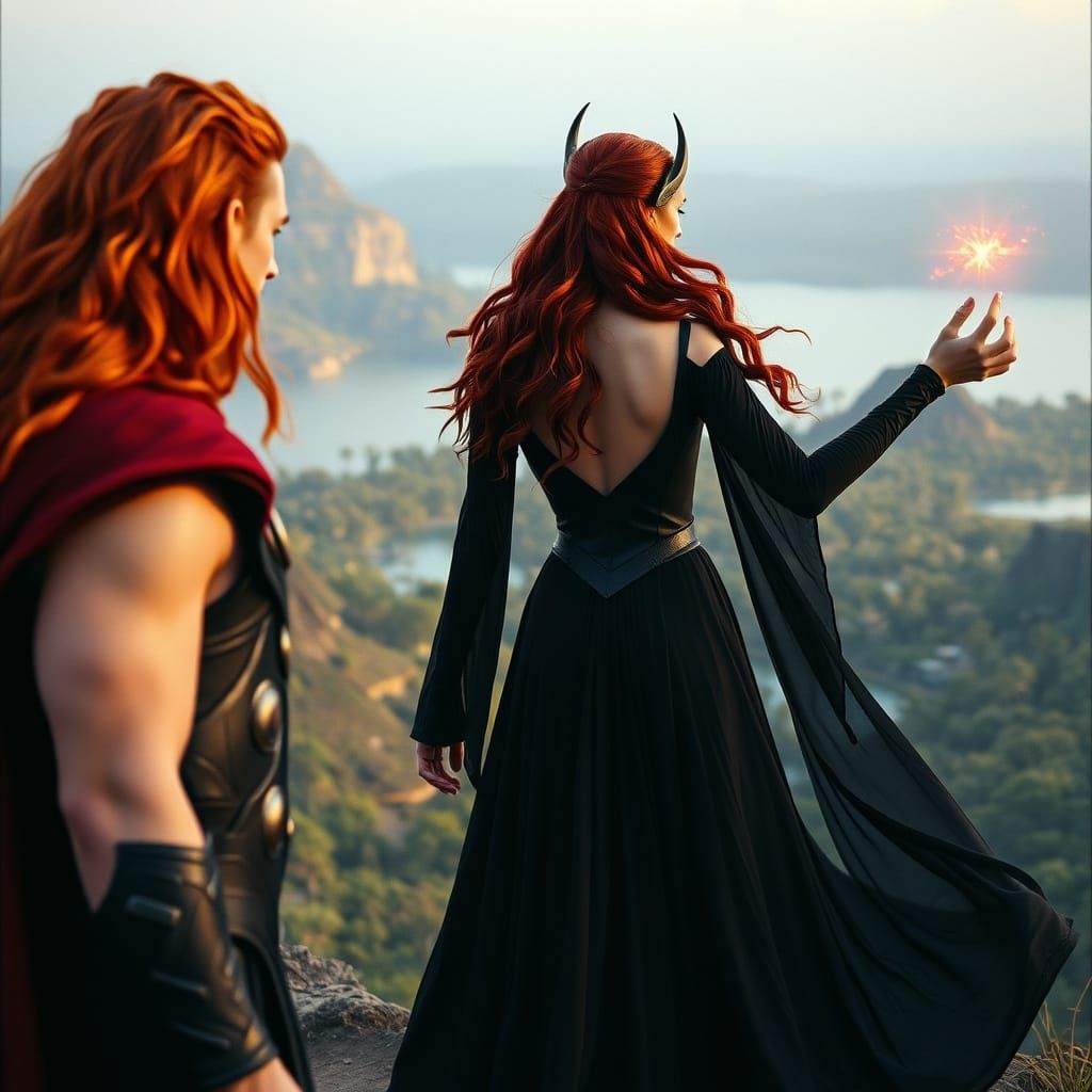A cinematic film still of Thor with red hair beside the Scarlet Witch as she casts a spell. They are overlooking a peaceful paradise landscape in a warm, golden tone.