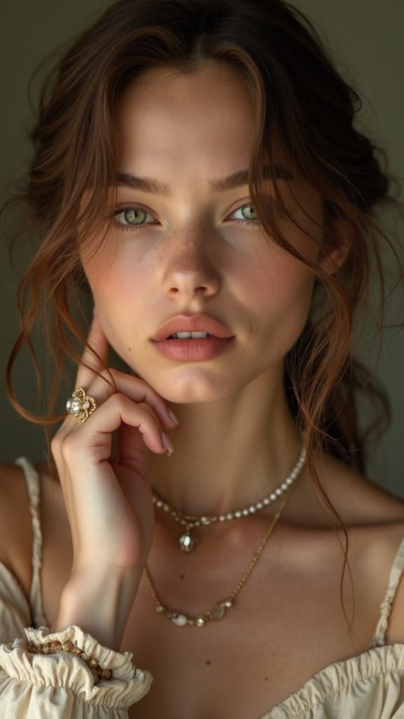 A captivating close-up of a beautiful young woman's face. The portrait captures her vulnerability and strength with dramatic lighting, soft focus, and glistening skin. The image has a cinematic realism.