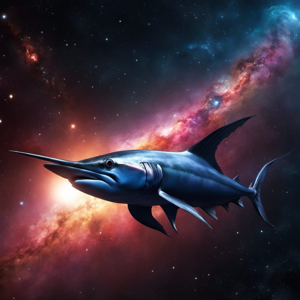 A hyperrealistic image of a swordfish swimming through a vibrant galaxy. The composition features deep colors, sharp details, and incredible lighting, creating a stunning visual experience.