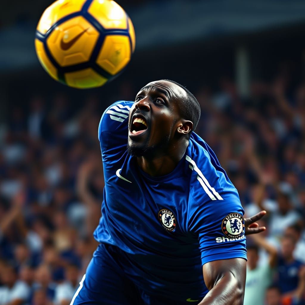 This image shows Didier Drogba in mid-air, heading a golden ball, wearing Chelsea's blue kit with sweat and intensity. The background shows blurred, ecstatic fans in a hyper-realistic style. This image is reminiscent of sports photography.