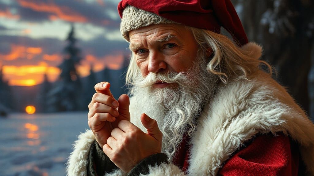 This is a hyperrealistic oil painting of a heroic, wise wizard with a long beard, practicing arcane arts at the North Pole during a dramatic sunset.