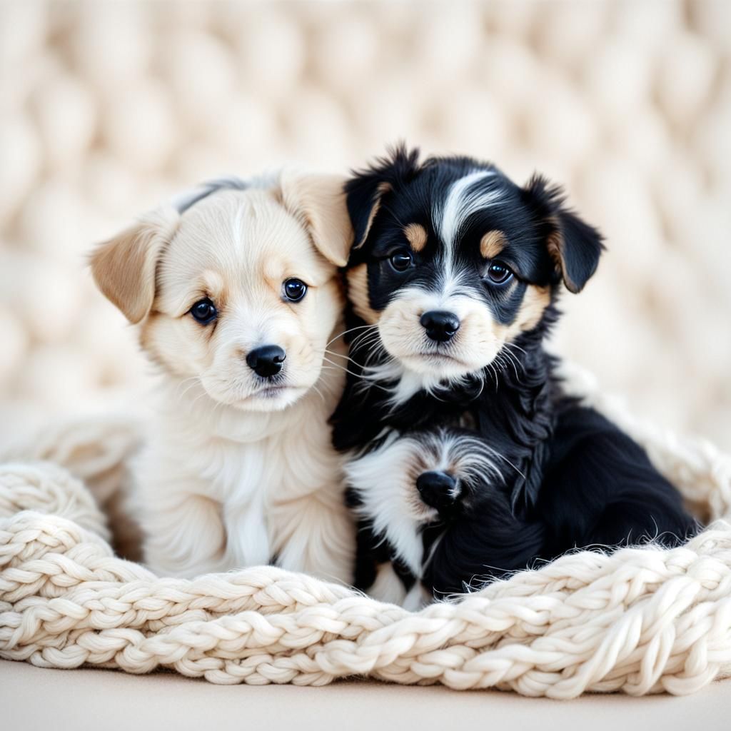 Image showcases three absolutely adorable puppies nestled together on a soft, knitted blanket. Detail is so intricate that each strand of fur seems tangible. These tiny canines with their innocent eyes and fluffy coats in shades of cream, tan and black, might just be perfect subjects.