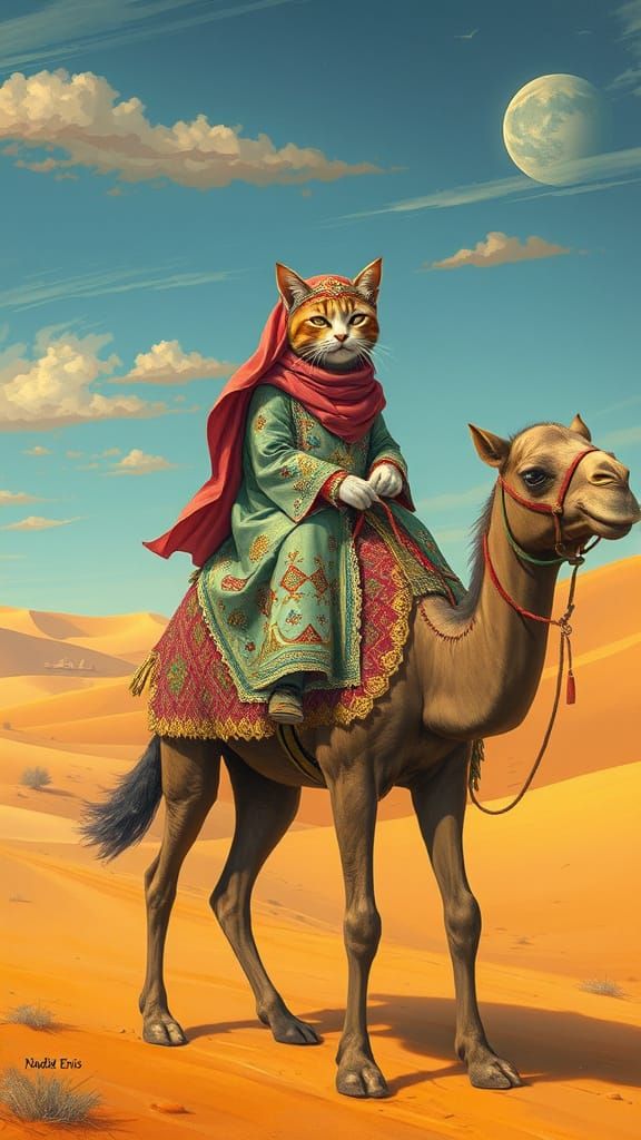 This image shows a cat in detailed Arabic clothing, riding a camel across a colorful desert. The artwork features intricate patterns and textures with a dreamy, whimsical aesthetic.