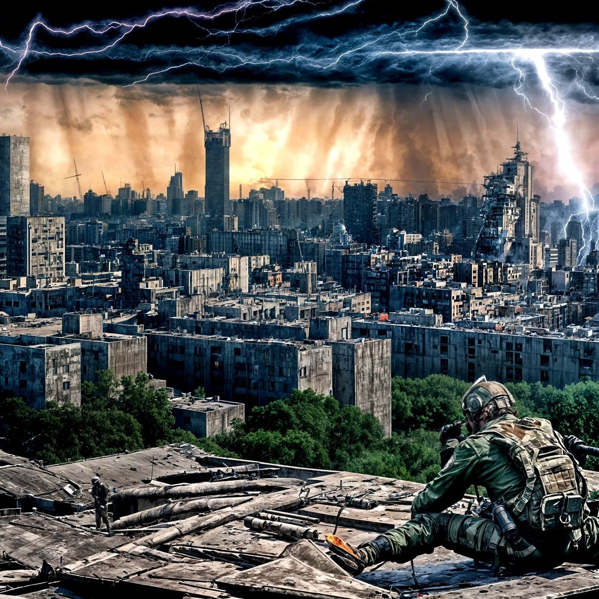 A soldier lies on the roof of a high-rise building. He is with his sniper rifle. The soldier looks through the rifle scope and shoots an angry unicorn in combat boots a kilometer away. The urban war zone smokes and burns. People try to save what can be saved. panorama complex detailed infinity post-apocalyptic ...