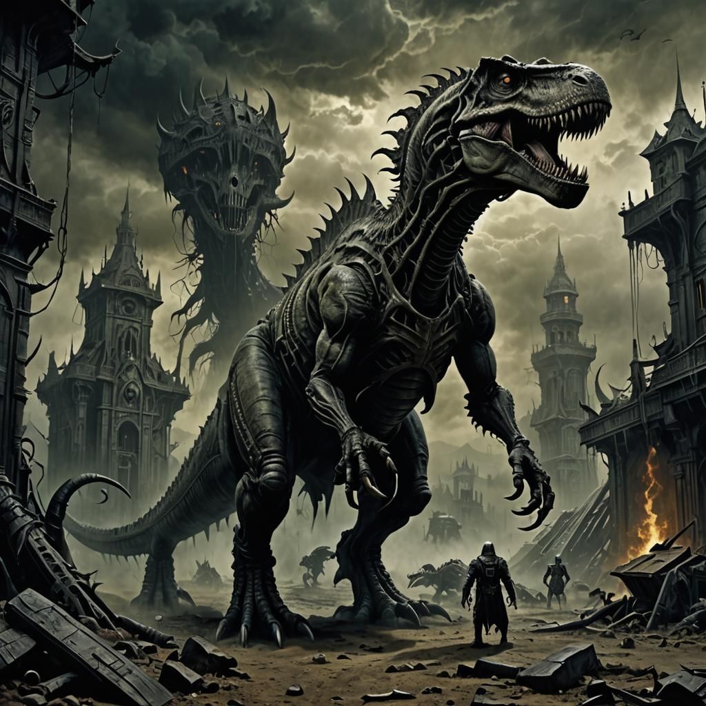This image shows a menacing Tyrannosaurus Rex in a macabre setting. The artwork features a matte painting style with a mysterious and ominous background, reminiscent of dark fantasy art.