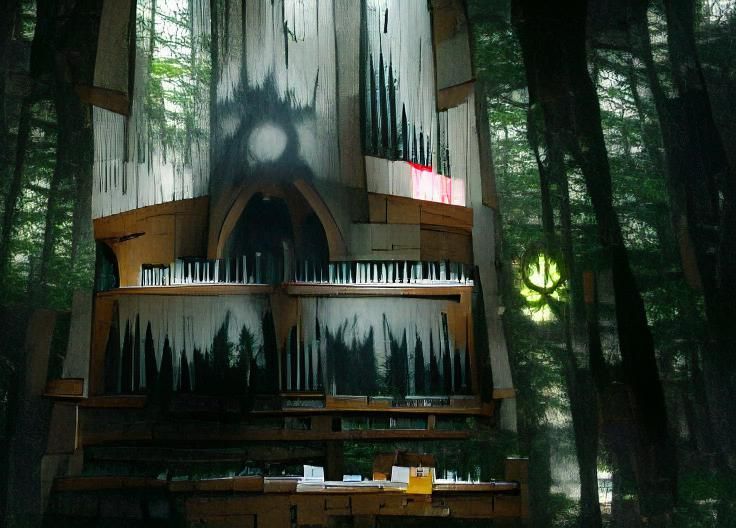 This image depicts a church organ situated within a large forest, with sunlight barely visible through the trees. The artwork evokes a sinister atmosphere.