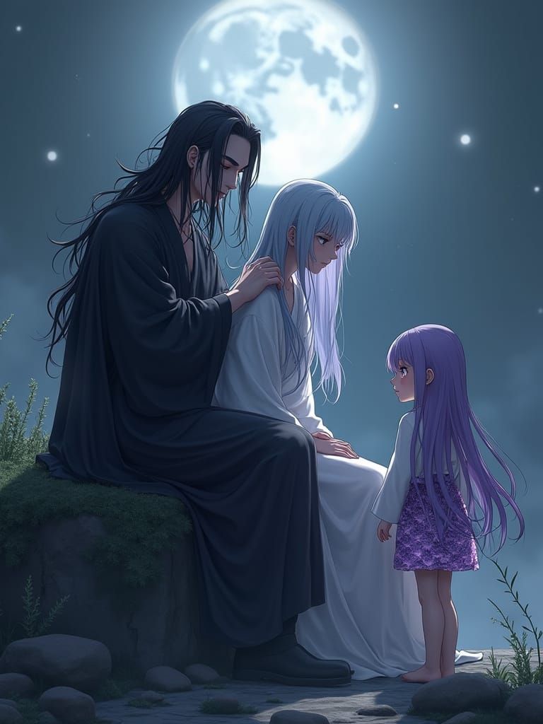 A poignant scene unfolds in a dark, mystical atmosphere, where a man in a flowing black kimono gently tends to a woman with silver hair, while a young girl with violet locks gazes up at him with hope.