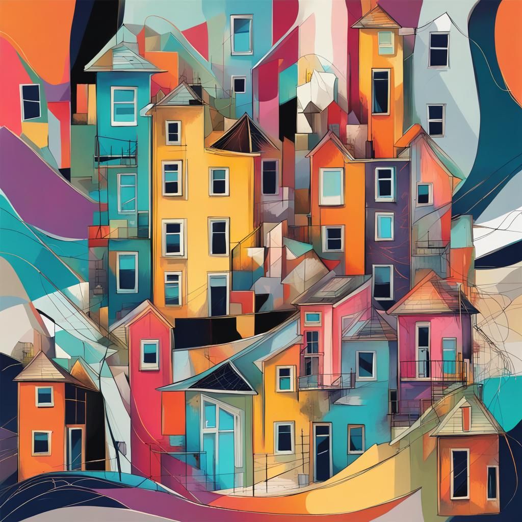 A vibrant, maximalist urban abstraction featuring unusual shapes in a seaside town setting. This image showcases fine details and complementary colors in an abstract vector fractal.