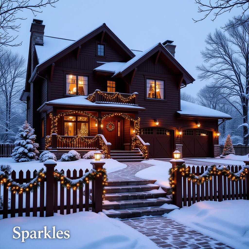 A large wooden house sits on snowy acreage, elaborately decorated for Christmas with lights and garlands. Cinematic film still with atmospheric lighting and color grading.