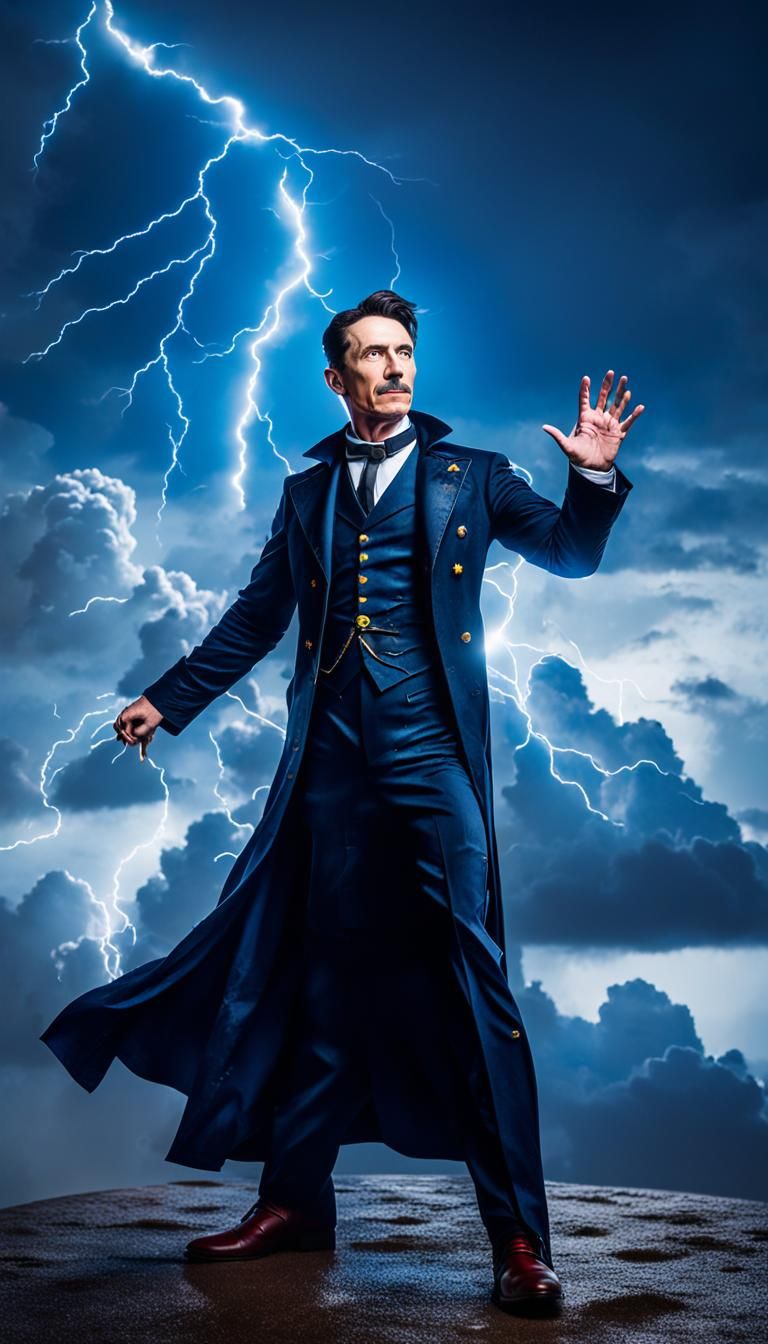 Create stunning images of Nikola Tesla as a superhero in a dramatic sky setting with our free AI image generator