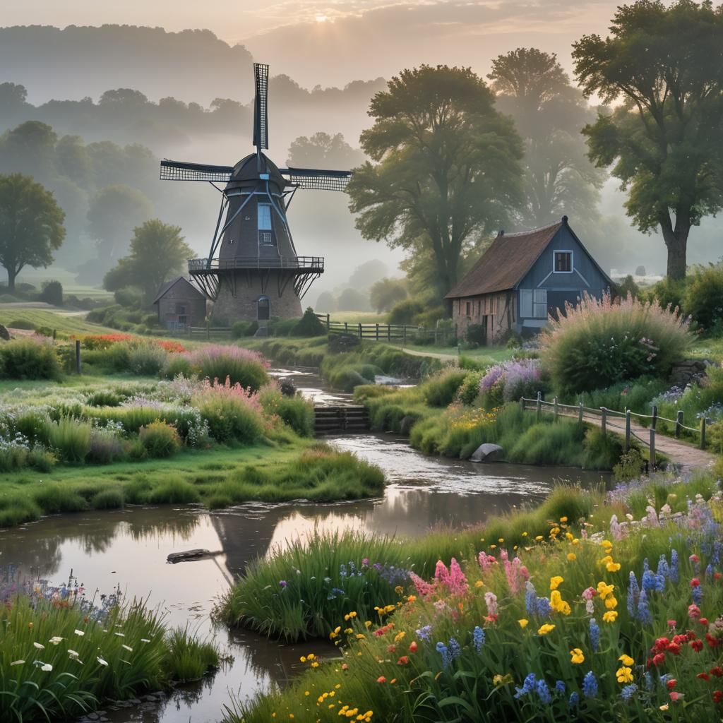 This image shows a Dutch windmill in a valley at dawn. A stone bridge crosses the river near wildflowers and a dirt road leading to the windmill, rendered as 3D matte fantasy art.