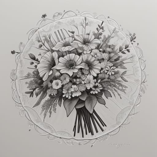 This beautiful, highly detailed line art piece showcases a delicate bouquet of flowers, including roses, poppies, and morning glories, set against a subtle background of additional blooms. Expressive lines and soft textures create a dreamy, elegant atmosphere.