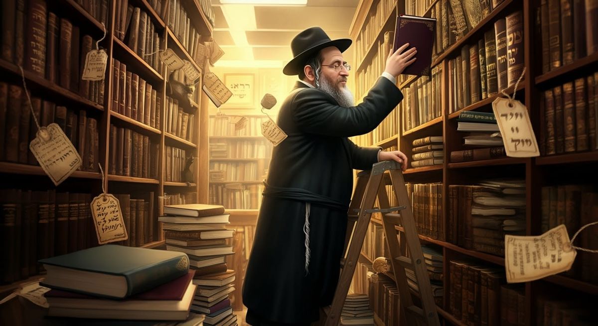 This image shows a Hasidic man in traditional clothing reaching for a book in a Jewish bookstore. The illustration blends photorealistic detail with comic elements and crisp digital rendering.