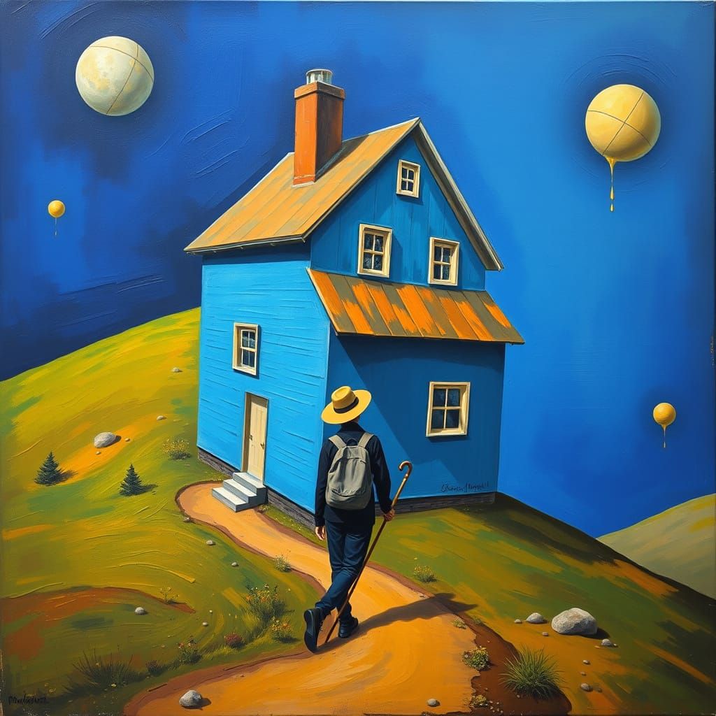 A striking picture of a figure with a walking stick approaching an odd blue house. The surreal image features melting objects and a dreamlike background, in a vibrant oil on canvas style.