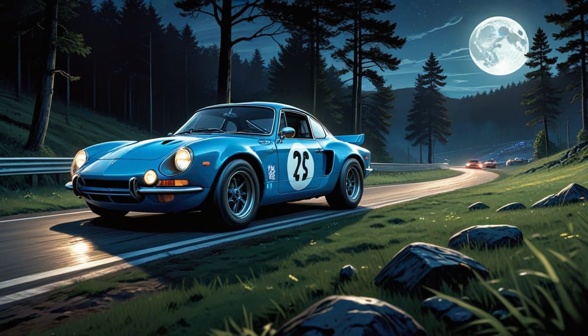 This image shows several Alpine A110 race cars speeding through the Circuit de Spa-Francorchamps at night. Rendered as hand-drawn color comic art, the scene includes fan campgrounds and moonlight shimmering in the sky.